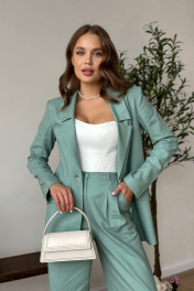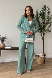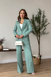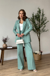 Костюм женский, состоящий из жакета и брюк. Жакет свободного силуэта длиной ниже линии бедер. Спинка со швом. Жакет с центрально-бортовой застежкой на 2 петли и пуговицы. Перед с нагрудными вытачками из бокового шва и наклонными рельефами, заканчивающимися на уровне кармана «в рамку». Ниже параллельно карману настрочен клапан. Воротник пиджачного типа с отложными лацканами. Рукава втачные двухшовные; по низу рукава обработана закрытая шлица с 4-мя пуговицами. Перед жакета на подкладке. Брюки - палаццо с застежкой на тесьму-молнию с гульфиком и откоском в среднем шве. Брюки на притачном поясе со шлевками и застежкой на одну прорезную петлю и пуговицу. Задняя часть пояса - на резинке. ЗП брюк с талиевыми вытачками. ПП брюк с двумя фиксированными складками и боковыми карманами. Длина жакета - 72,5 см - 73,7 см Длина рукава жакета - 62 см Длина брюк - 115,4 см