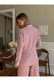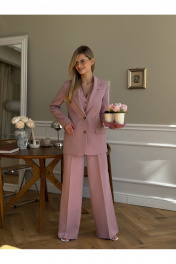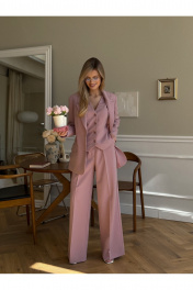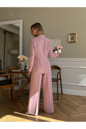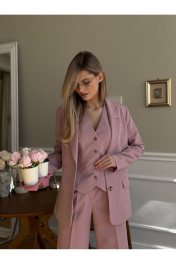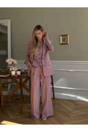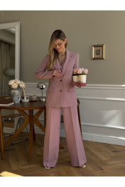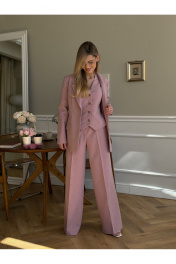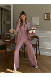 Костюм женский, состоящий из жакета, жилета и брюк. Жакет полуприлегающего силуэта, длинной ниже линии бедер. Спинка с вертикальными рельефами. Перед с центрально-бортовой застежкой на 2 петли-пуговицы и воротником пиджачного типа, вертикальными рельефами, доходящими до линии кармана в рамку с клапаном. Рукава втачные двухшовные. Жакет на подкладке. Брюки - палаццо с центрально застежкой на тесьму молнию с гульфиком и откоском; с притачным поясом со шлевками, застегивающимся на 1 прорезную петлю и пуговицу. Задняя часть пояса - на резинке. ПП брюк со складками, переходящими в стрелки и боковыми карманами. ЗП брюк с 2-мя парами таллиевых вытачек и стрелками. Жилет прилегающего силуэта с центральной бортовой застежкой на 4 прорезные петли и пуговицы. Перед - с талиевыми вытачками и отрезным бочком. Спинка со средним швом и рельефами от проймы до низа, в которые на уровне талии втачаны хлястики. Хлястики с запахом; закреплены на 2 пуговицы. Вырез горловины V-образный. Жилет на подкладке. Длина жакета - 71,2 см Длина рукава жакета - 62,7 см Длина жилета — 49,5 см Ширина плеча жилета — 7,2 — 7,6 см Длина брюк - 120,5 см.