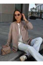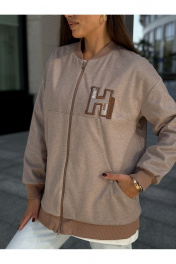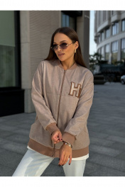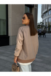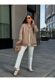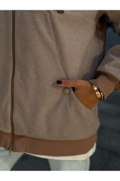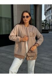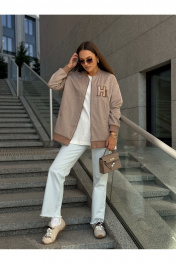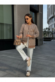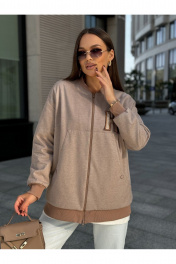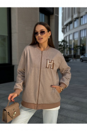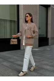 Бомбер женский, прямого силуэта, со спущенной линией плечевого шва, выполнен из облегченной пальтовой ткани. Спинка без конструктивных особенностей. Перед с застежкой на тесьму-молнию, с нагрудной вытачкой. По переду обработаны накладные карманы-кенгуру. Сверху и частично по линии входа в карман - настрочены. Карман закрывается декоративной кнопкой. На левой половинке переда настрочена нашивка. Низ изделия обработан притачными планками из отделочной ткани. Рукава втачные, одно шовные. По низу рукава притачные манжеты из отделочной ткани. Воротник стойка с закругленным концом из отделочной ткани. Бомбер на подкладке.
