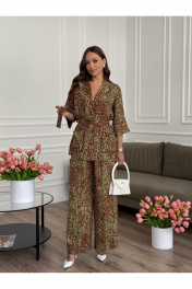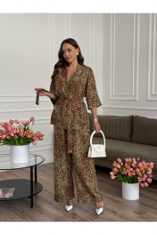 Комплект женский двухпредметный, состоящий из брюк и блузы. Брюки прямого широкого силуэта. По ПП брюк обработаны косые боковые карманы. По среднему шву брюк имитация застежки. В боковой шов брюк вставлен кант из отделочной ткани. Брюки обработаны поясом с резинкой. Блуза прямого силуэта, линия плечевого шва немного спущена. Перед с нагрудными вытачками из бокового шва, и накладными карманами. В шов кармана вставлен кант из отделочной ткани. Блуза с центрально-бортовой застежкой на 4 петли-пуговицы и воротником пиджачного типа. По переду в районе бокового шва настрочены шлевки для протягивания пояса. Спинка без конструктивных особенностей. Рукава втачные одно шовные, с притачной манжетой. В шов притачивания манжеты вставлен кант из отделочной ткани. Длина рукава блузы — 38 см Длина блузы — 71,5 — 72,5 см Длина брюк — 109 см