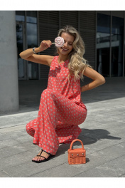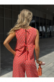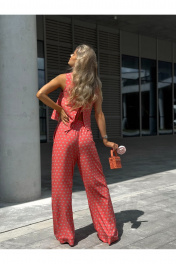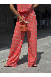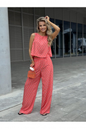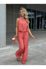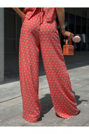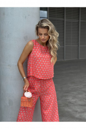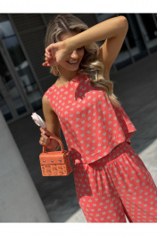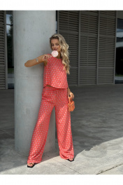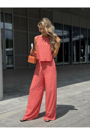 Костюм женский двух-предметный, состоящий из брюк и блузы. Брюки прямого широкого силуэта. По ПП брюк обработаны косые боковые карманы. Брюки обработаны поясом с резинкой. Блуза прямого силуэта, укороченная. Перед с нагрудными вытачками из бокового шва. Спинка состоит из двух частей, которые между собой завязываются на шнурки. Вырез горловины «лодочка» Ширина плеча блузы — 6,6 — 7,4 см Длина блузы — 45,5 — 48,5 см Длина брюк — 111 см.