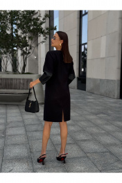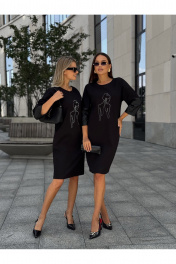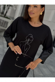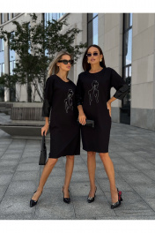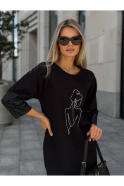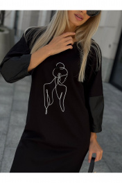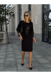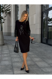 Платье прямого силуэта, со спущенной линией плеча и длиной до линии колена. Спинка со средним швом и разрезом по низу. Перед без конструктивных особенностей, с печатью и декором «цветок». Горловина округлой формы, обработанная бейкой из ткани верха. Рукава спущенные из кожаного полотна. По низу рукава застрочены вытачки. Длина платья — 95,4 — 98,9 см Длина рукава платья — 54-56,5 см Состав ткани: вискоза – 67%, Полиамид – 28%, Спандекс – 5%.