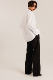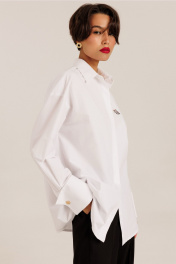 Блузка женская "оверсайз" прямого силуэта. Воротник отложной на стойке. Рукав спущенный с притачной широкой манжетой с отворотом и с акцентной пуговицей. Разрез рукава обработан планкой. Застежка по переду потайная, на пробивные петли и пришивные пуговицы. Дизайнерская вышивка.