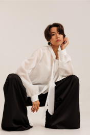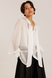 - ОписаниеБлузка женская выполнена из полупрозрачного лиоцела. По горловине изделия выполнена стойка. Рукав длинный. Застежка потайная на пуговицах. В комплекте с блузкой идет топ на регулируемых бретелях