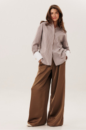 Рубашка- блузка ‘оверсайз’ прямого силуэта. Воротник отложной на стойке. Рукав спущенный с притачной манжетой с отворотом. Разрез рукава обработан планкой. Застежка по переду потайная, на пробивные петли и пуговицы.