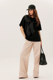 Майка свободного прямого силуэта со спущенным плечом.Рукав четвертной. По переду завязывается декоративный бант.