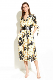 Платье женское полуприлегающего силуэта из плательной ткани. Рукава втачные - по окату рукава сборка ,по низу притачная манжета с завязкой бант. Платье по линии талии отрезное, по талии вставлена эластичная тесьма. Лиф платья с нагрудными выточками на запах. Платье дополнено декоративным поясом.
