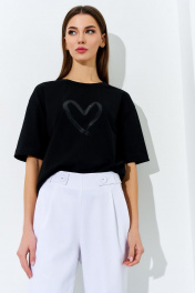 Брюки женские полуприлегающего силуэта из джинсовой ткани. По переду обработаны односторонние складки. По застроченным складкам проложена отделочная строчка. Спинка с талевыми вытачками. В боковом шве обработана застежка на потайную тесьму «молния». Верхний срез брюк обработан обтачкой. Полупояс продевается через настроченные шлевки и застегивается на пуговицы на переде. Низ брюк обработан швом в подгибку в чистый край.