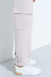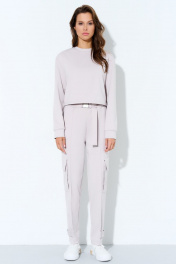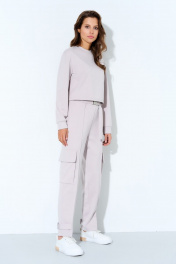 Костюм женский в спортивном стиле из трикотажного полотна. Джемпер укороченный. Рукав одношовный на манжете. Горловина обработана бейкой. Низ джемпера подшит на плоскошовной машине с эластичной тесьмой внутри. По передним половинкам застрочен защип, имитирующий кант. На боковых швах в области колена настрочены накладные карманы "портфель" и закрыты клапаном. По низу брюк из защипа выходит пата, и через шлевку, настроченную на задней половинке застегивается на кнопку. Пояс стачной с эластичной тесьмой внутри. В шов стачивания пояса вставлены полупояса, которые застегиваются на пряжку.