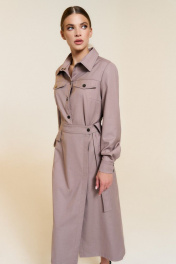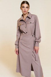 Платье женское полуприлегающего силуэта из ткани платьево-костюмного ассортимента. Перед отрезной по линии талии ассиметричной формы. На лифе отрезные кокетки, в шов притачивания кокеток вставлены клапаны. На лифе застежка по лифу на пробивные кнопки,по юбке на пришивные кнопки. В боковых швах юбки обработаны карманы. По переду юбки с права подрезной бочок полукруглой формы с клапаном. Между лифом и юбкой имитация пояса, переходящего в застежку. Воротник отложной на стойке. Низ платья подшит швом вподгибку с закрытым срезом.