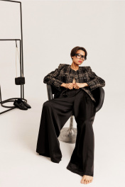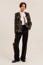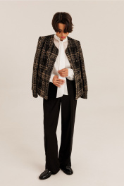 Жакет женский прямого силуэта из ткани костюмного ассортимента черного цвета с бежевой клеткой на подкладке. Перед с рельефами, входящими в плечевой шов и накладными карманами с закругленными нижними углами. На верхних карманах пришиты декоративные пуговицы. Спинка разрезная. Рукав втачной двухшовный с втачными манжетами слегка закругленной формы. Манжет застегивается на пробивные петли и пуговицы. Горловина округлой формы. Борт прямой с застежкой на петли и пуговицы.