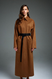 Легкое пальто прямого силуэта, однобортное, на подкладке, с отложным воротником. Линия плеча спущенная с притачным одношовным рукавом.. На уровне бедер по полочке выполнены прорезные карманы с листочками. По спинке шлица.Застежка потайная на пуговицы. Дополнительно в комплекте лента-пояс на пряжке.