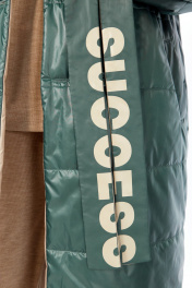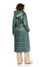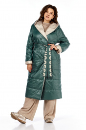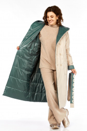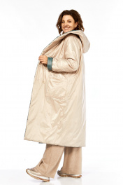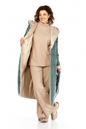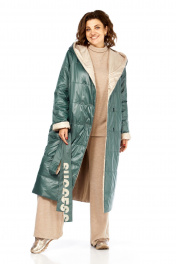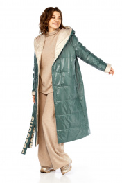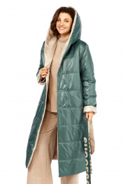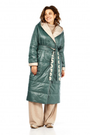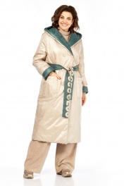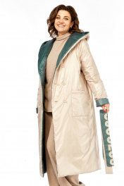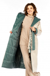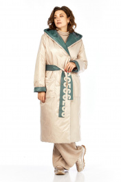 Пальто женское прямого силуэта с двубортной застежкой на 6 пуговиц. Пальто двухстороннее. Светлая сторона выстегана синтепоном. Перед с боковыми прорезными карманами с листочкой на светлой стороне и накладными на темной. Рукава втачной, двухшовный. Воротник-капюшон цельнокроеный с полочкой. Пояс съемный, двухсторонний, по светлой стороне украшен печатью. Длина по спинке 119 см, длина рукава 67 см.