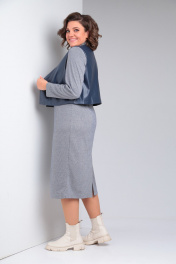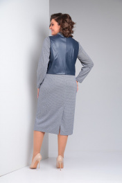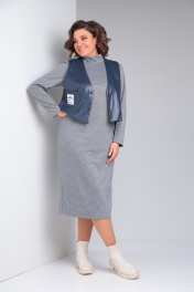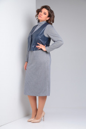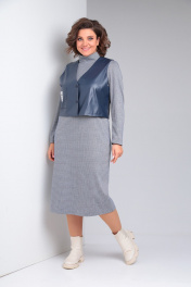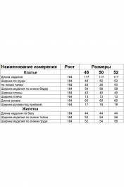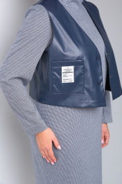 Комплект женский состоит из платья и жилета. Платье полуприлегающего силуэта длиной миди. Перед с нагрудными вытачками. Спинка с талиевыми вытачками и средним швом, сверху которого обработанная застежка на потайную молнию , а снизу шлица. Рукав втачной одношовный. Воротник - стойка. Жилет из экокожи с центральной застежкой на кнопки. Перед с нагрудным накладным карманом с нашивкой. Спинка со средним швом. Горловина V-образной формы. Жилет на подкладке, притачной по низу.