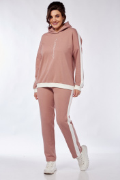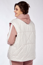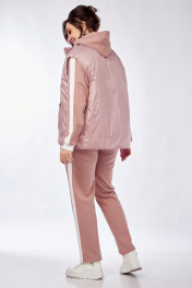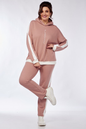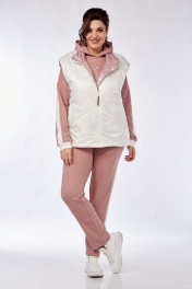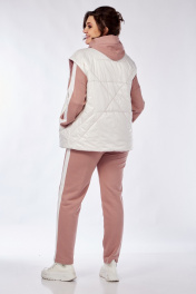 Комплект брючный(кофта +брюки+жилетка).Кофта прямого силуэта со спущенным плечом , рукав втачной одношовный с притачным манжетом, по низу изделия притачной пояс. Горловина обработана бейкой. По плечевому шву и рукаву лампас из отделочной ткани. Брюки прямые,верхний срез обработан поясом с резинкой и шнуром. По боковым швам лампас из отделочной ткани. Жилетка полуприлегающего силуэта с центральной застёжкой на тесьму-молнию,двусторонняя обработаны прорезные карманы с листочкой и накладные карманы с другой стороны. Используется две ткани. В качестве отделки используется отделочная строчка ,фурнитура,вышивка.