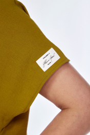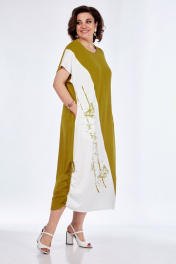 Платье женское свободного кроя расклешенное к низу. Спинка со средним швом. Перед с ассиметричным разрезом подиагонали. Правая часть переда из отделочной ткани с печатью в виде бабочек. Горловина округлой формы. По бокам внизу обработаны кулисы с завязками. Платье со спущенной линией плеча.