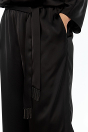 Комбинезон женский свободного кроя. Верхняя часть с потайной молнией и средним швом на спинке, и V-образным вырезом. Декоративная молния по переду. Нижняя часть с боковыми карманами в швах. По линии талии притачной пояс с резинкой. Съемный пояс украшен бахромой на концах. Рукав цельнокройный "летучая мышь".