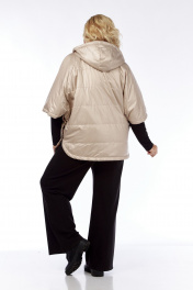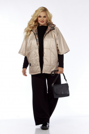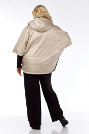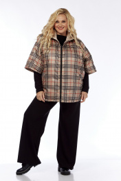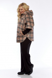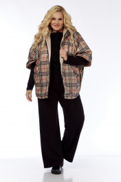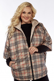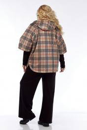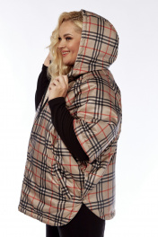 Пончо 2-ух стороннее с центральной бортовой застежкой "молния". Светлая сторона: по переду и спинке выполнена горизонтальная стежка. Перед с накладными карманами "кенгуру". Сторона в клетку: перед с боковыми прорезными карманами "с листочкой". По боковым швам застежка на три кнопки образует разрезы округлой формы. Воротник-капюшон. По краю отделочная строчка на 2,5 см.