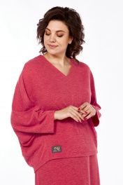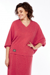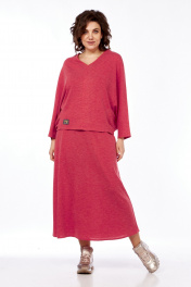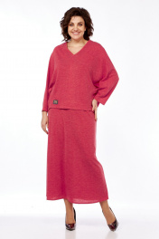 Костюм женский с юбкой из трикотажа. Кофта с цельнокроенными рукавами и отрезными бочками. Перед со средним швом и защипом на 0,2 см вдоль него. Спинка со средним швом. Горловина V-образной формы. В качестве отделки нашивка в правом нижнем углу переда. Юбка длинная, расклешеная к низу. Заднее полотнище со средним швом. Пояс выполнен из декоративной эластичной тесьмы. Внешний вид фурнитуры может отличаться от заявленной на фото.