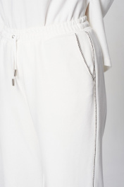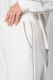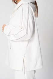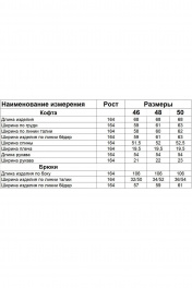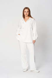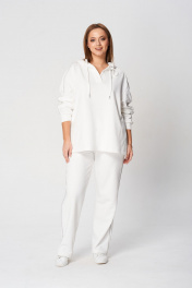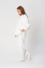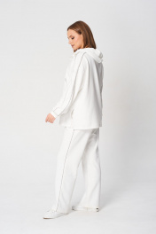 Комплект брючный (кота+брюки). Кофта полуприлегающего силуэта, спущенная линия плеча. Лампас по плечевому шву, переходящий на рукав. По низу рукава манжет. По боковым швам-разрезы. Горловина V-образная. Капюшон с отделочной деталью-планкой по отлету, для регулировки объема протянут шнурок. Брюки прямые, в боковых швах обработаны карманы. Верхний срез обработан поясом на резинке со шнуром. В качестве отделки используется декор-кант по боковым швам брюк, кармана и лампаса рукава.