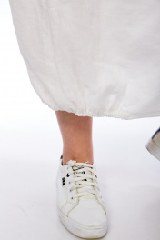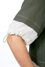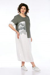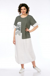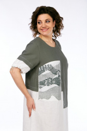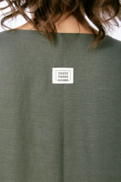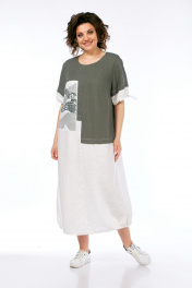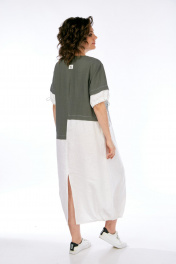 Платье женское совбодного кроя. Спинка с ассиметричными подрезами, средним швом, в низу с разрезом. Перед со средним швом, нагрудными вытачками, подрезами на разном уровне. На правой части переда настрочена деталь с печатью. Рукав втачной, одношовный, с декоративной отделочной деталью, собраной по низу на шнур в кулисе. По бокам низ собран на резинку. В качестве отделки спинки используется нашивка. Нашивка модет отличаться от заявленной на фото.
