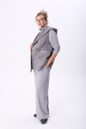 Комплект брючный состоит из кофты, жилетки и брюк. Кофта полуприлегающего силуэта со спущенным плечом, рукав втачной, одношовный. Воротник стойка с застежкой на тесьму-молнию. По боковым швам разрезы. Брюки расширенные книзу, верхний срез обработан поясом с резинкой. В боковых швах карманы. Жилетка свободного кроя со смещенной застежкой на петлю и пуговицу. По спинке горизонтальный рельефный шов на перед, в котором обработаны карманы. Цельнокроенный капюшон с центральной частью. В качестве отделки используется фурнитура. Длина кофты по спинке 66-72 см, длина рукава 54 см. Длина жилетки по спинке 72-80 см. Длина брюк 108-110 см