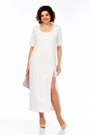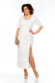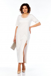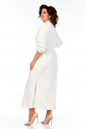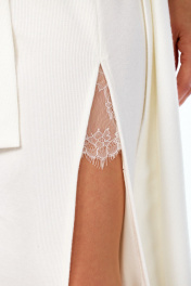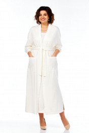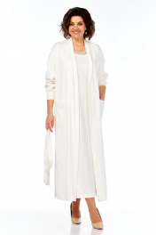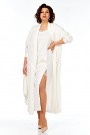 Комплект женский состоит из платья и длинного кардигана со съемным поясом. Платье полуприлегающего силуэта. Спинка со средним швом, перед с подрезом по левому боку, переходящим в разрез с декором из кружева. Рукав втачной одношовный, длиной до локтя. Горловина округлой формы, украшена кружевом. Кардиган с разрезами по бокам. Рукав втачной одношовный с манжетами. По переду притачная бейка. Пояс съемный. Длина платья по спинке 132 см, длина рукава 30 см. Длина кардигана по спинке 136 см, длина рукава 52 см.