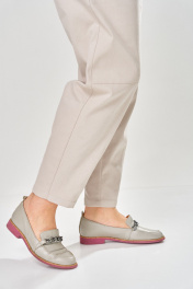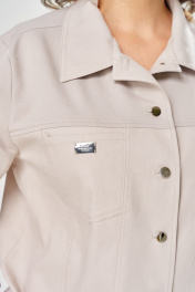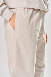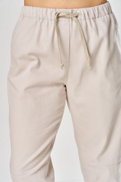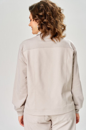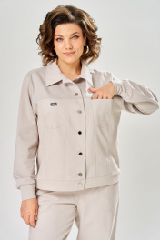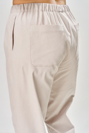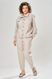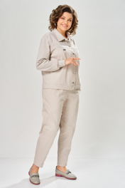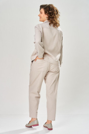 Комплект брючный состоит из жакета и брюк. Жакет полуприлегающего силуэта с центральной застежкой на петли и пуговицы. По переду кокетка, рельефные швы до низа, отрезной пояс по низу. Рукав втачной , одношовный полной длины с манжетом. Воротник стояче-отложной. Брюки зауженные к низу, застрочены вытачки, на передних половинках на уровне колена застрочены вытачки, в боковых швах обработаны карманы с листочкой, на задней половинке накладные карманы.Пояс с резинкой и шнурком. Длина по спинке 62 см, длина рукава 62 см. Длина брюк 96 см.
