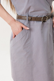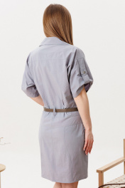 Платье женское полуприлегающего силуэта с застежкой на молнию в левом боковом шве. Перед с плечевыми кокетками, отрезным поясом со шлевками, нижняя часть переда с запахом, воротник отложной с лацканами. Нижняя часть переда с рельефами и карманами от рельефа к боковому шву. Спинка с плечевой кокеткой, отрезным поясом, средним швом и рельефами от кокеток до низа. Рукава украшены хлястиками с петлей и пуговицей. В комплекте съмный пояс. Фурнитура может отличаться от заявленной на фото. Длина по спинке 94 см, длина рукава 23 см.