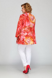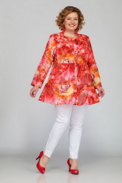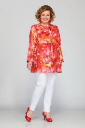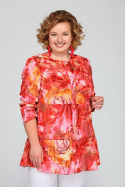 Блуза женская А силуэта. Вырез горловины круглый. По центру переда приточная планка. По планке обработана застежка на 6 прорезных петель и 6 пуговиц. По переду и спинке горизонтальные подрезы. Рукав втачной одношовный. Ткань шифон с узорным бархатным напылением. Длина изделия 78 см, рукава 57 см