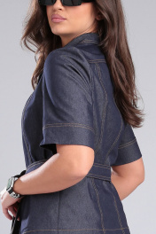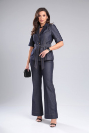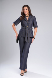 Стильный летний костюм из джинсовой ткани с двойной отстрочкой. Жакет полуприлегающего силуэта с поясом. Рукав втачной, короткий. Воротник с лацканами отложной, застежка на кнопки. Брюки высокой посадки на поясе с резинкой по спинке . В боковых швах карманы с отрезным бачком. Застежка на молнию и кнопки спереди.