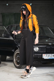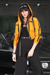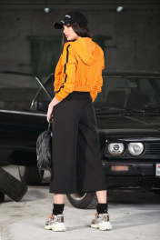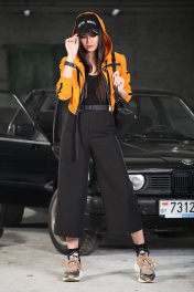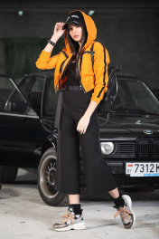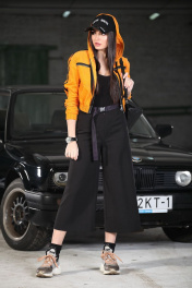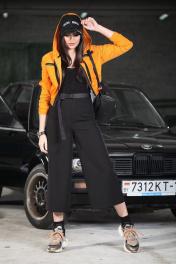 Укороченная куртка – ветровка из хлопкового вельвета в микро рубчик с эффектом “ креш”. Куртка ветровка свободного силуэта с капюшоном, низ на эластичном поясе рукав втачной с эластичной манжетой, по полочкам нагрудные функциональные карманы с декоративной молнией, по рукаву и плечу отделочная лента –лампас, застежка молния, без подкладки. Куртка: длина по спинке 45 см, длина рукава – 53см.