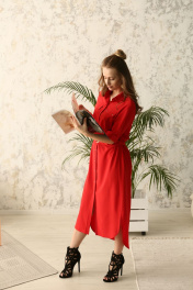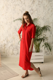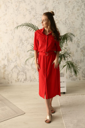 Платье прямого силуэта с втачным покроем рукава. Застежка на цельнокроеной планке на петли и пуговицы. Воротник рубашечного типа. Пояс съемный с пряжкой. По переду нагрудные карманы с клапанами и застежкой на петли и пуговицы. По спинке кокетка со встречной складкой. Низ платья фигурной формы с разрезами по боковым швам . Длина изделия по спинке 133 см. Длина рукава 29 см.