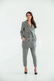 Жакет полуприлегающего силуэта с втачным покроем рукава, на подкладке. Воротник шалевый, застежка двубортная на шесть петель и пуговиц. В рельефных швах расположены карманы. Нагрудные выточки идут из рельефного шва к центру груди. Спинка со средним швом. Рукав двухшовный. Длина жакета по спинке 81-83см, длина рукава 60см. Брюки слегка заужены к низу с манжетой. Верхний срез брюк на поясе и с декоративной резинкой по спинке. По переду карманы идут от верхнего среза к боковым швам. Длина брюк по боковому шву 95см.
