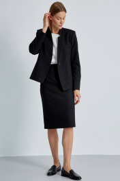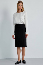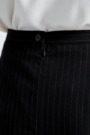Юбка женская классическая – маст хэв в любом базовом гардеробе современной деловой женщины. Юбка зауженная к низу длиной до середины колена из черной костюмной ткани на основе вискозы в тонкую полоску добавит строгости за счет цвета и создаст идеальный элегантный силуэт. Верхний край оформлен притачным поясом. Застежка на 1 петлю-пуговицу по поясу и потайную молнию. Сзади обработана шлица. Юбка на притачной подкладке.