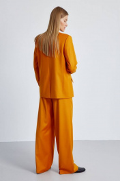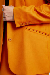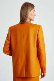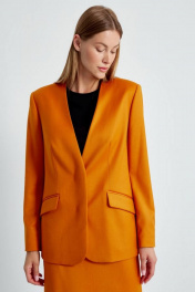 Жакет женский прямого кроя, длиной до линии бедра, на подкладке, с комфортной посадкой не сковывающей движения. Жакет выполнен из костюмной ткани, приятной на ощупь, в ярком осеннем цвете «хурма». Подкладка выполнена из шелковистой вискозной ткани, по контуру подкладки вставлен контрастный кант синего цвета, что подчеркивает качество пошива и придает жакету особую изысканность. Карманы функциональные с клапанами. Рукава прямые, двухшовные, длинные, заканчиваются шлицей с имитацией застежки на роговые пуговицы. Жакет двубортный без воротника, с однобортной потайной застежкой. Жакет будет одинаково красиво смотреться с брюками арт.4474, юбкой 4499, что создаст идеальный комплект. Длина рукава 64см., длина спинки 72см.