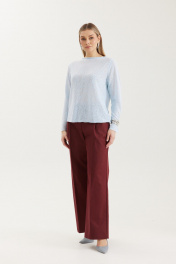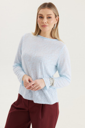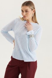 Джемпер из лёгкой трикотажной полупрозрачной ткани небесно‑голубого оттенка. Тонкая текстура с деликатным рельефом придаёт модели воздушность и утончённость. Длинные рукава создают гармоничный силуэт, а мягкая посадка обеспечивает комфорт и лёгкость движений. Универсальная модель легко сочетается как с классическими брюками, так и с более яркими акцентами, формируя современный и стильный образ.