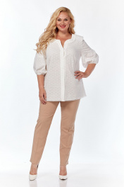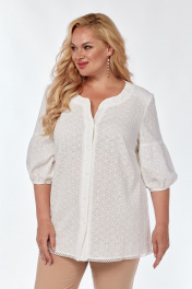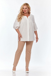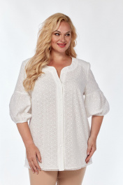 Белоснежная блуза прямого силуэта из хлопковой ткани, позволит создать вам необходимый легкий образ, комфорт и удобство. По центру полочки застежка в виде планки на петли и пуговицы. Вырез горловины V-образной формы, фигурный. Рукав втачной, в исполнении «фонарик», благородно выглядит в тканях, которая держит форму.