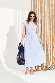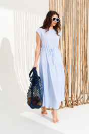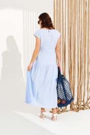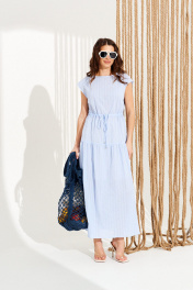 Платье умеренного объема, приталенного силуэта, отрезное по линии талии, со спущенной линией плеча и подъюбником из хлопковой подкладки. Нижний срез переда и спинки оформлен воланами. Приталенность регулируется кулиской со шнуром-завязкой и наконечниками. Длина изделия на модели вдоль середины спинки — 129,5 см (допустимое отклонение +/- 1 см)