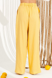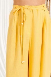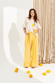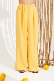 Брюки свободного объема, слегка расширены книзу. На передних половинках выполнены боковые карманы с отрезным бочком и односторонние складки. На задних половинках выполнены талиевые вытачки. Застежка — гульфик на молнии. Пояс притачной, с резинкой по спинке, застежкой на петлю и пуговицу и двойными шлевками. В шлевки продеты декоративные шнуры-завязки с наконечниками. Длина изделия на модели вдоль бокового шва с учетом пояса — 110,5 см (допустимое отклонение +/- 1 см)