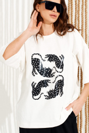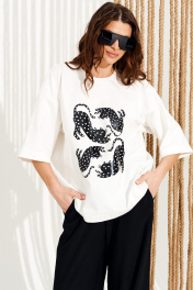 Джемпер из трикотажного полотна свободного объема, прямого силуэта, с круглым вырезом горловины.Перед и спинка цельные. Вырез горловины обработан притачной обтачкой. По переду выполнена печать «Котики». Рукав втачной, одношовный, короткий. Длина изделия на модели вдоль середины спинки — 68,5 см (допустимое отклонение +/- 1 см)