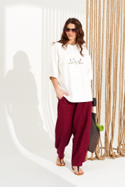 Джемпер из трикотажного полотна свободного объема, прямого силуэта, с круглым вырезом горловины. Вырез горловины обработан притачной обтачкой. Перед и спинка цельные. По переду выполнена вышивка «Утенок». Рукав втачной, одношовный, короткий. Длина изделия на модели вдоль середины спинки — 68,5 см (допустимое отклонение +/- 1 см)