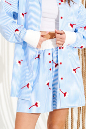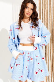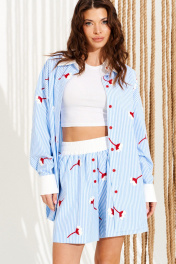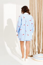 Блузка умеренного объема, прямого силуэта, с центральной застежкой на петли и пуговицы. Воротник стояче-отложной с отрезной стойкой. Спинка с притачной кокеткой и бантовой складкой. Боковые швы заканчиваются разрезами. Рукав втачной, одношовный, длинный. Нижний срез рукава с разрезом, обработан притачной манжетой с застежкой на одну петлю и одну пуговицу. Воротник, отрезная стойка и манжеты выполнены из контрастного материала. Длина изделия на модели вдоль середины спинки — 67,5 см (допустимое отклонение +/- 1 см)