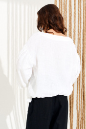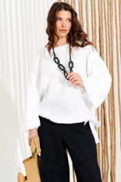 Блузка свободного объема, прямого силуэта, с круглым вырезом горловины. Горловина обработана цельнокроеными обтачками. Нижний срез оформлен кулиской, в которую продет пояс-завязка. Рукав втачной, длиной 3/4, одношовный, на подкладке, со сборкой по верхнему и нижнему срезам. Длина изделия на модели вдоль середины спинки — 65,5 см (допустимое отклонение +/- 1 см)