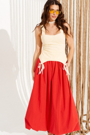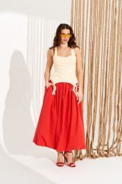 Блузка приталенного силуэта, отрезная по линии талии, на бретелях и подкладке. Перед с рельефами, отрезными чашками, фигурной линией низа и декоративными бантами. Спинка с рельефами, средним швом и застежкой на тесьму-молнию. Центральные части спинки прострочены эластичной тесьмой. Длина изделия на модели вдоль середины спинки с учетом бретели — 48 см (допустимое отклонение +/- 1 см)