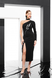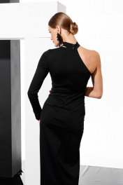 Платье прилегающего силуэта длиной миди из трикотажного полотна. По переду декоративный элемент в виде вышивки. Горловина ассиметричная со стойкой. В рельефе по переду изделия разрез. Спинка со средним швом и застежкой на потайную молнию. Рукав длинный ассиметричный втачной.