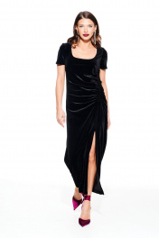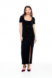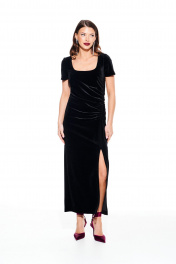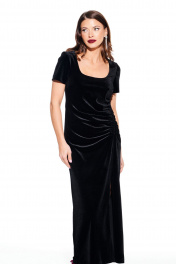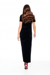 Платье из бархата на трикотажной основе, полуприлегающего силуэта, с фигурным вырезом горловины. По переду нагрудные вытачки, рельеф со сборкой на резинку и разрез. Спинка цельная. Рукав втачной, короткий. Длина платья до щиколотки.