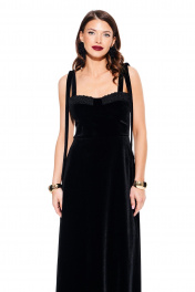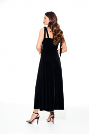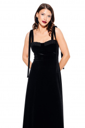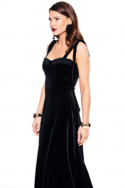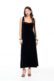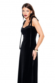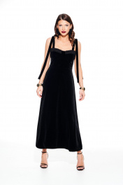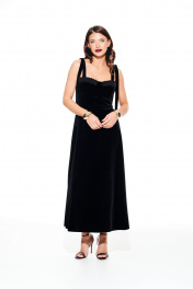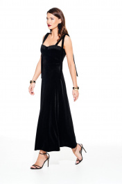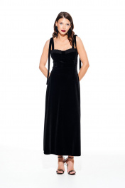 Платье из бархата на трикотажной основе, приталенного силуэта, отрезное на уровне линии талии, на бретелях с завязками, с застежкой на потайную молнию в среднем шве спинки. Лиф переда с рельефами и отрезными чашками. Верхняя деталь чашки оформлена декоративной вставкой из бусин. Спинка с рельефами и средним швом. Лиф платья на подкладке. Длина платья до щиколотки.