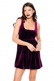 Платье из бархата на трикотажной основе, отрезное, приталенного силуэта, с фигурным вырезом горловины, с застежкой на потайную молнию в среднем шве спинки, на подкладке. Перед и спинка с рельефами. Нижняя часть платья формы "баллон" со сборкой по верхнему срезу. В боковых швах расположены завязки. Длина – мини.
