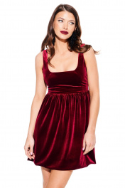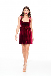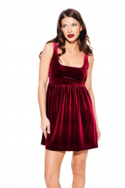 Платье из бархата на трикотажной основе, отрезное, приталенного силуэта, с фигурным вырезом горловины, с застежкой на потайную молнию в среднем шве спинки, на подкладке. Перед и спинка с рельефами. Нижняя часть платья формы "баллон" со сборкой по верхнему срезу. В боковых швах расположены завязки. Длина – мини.